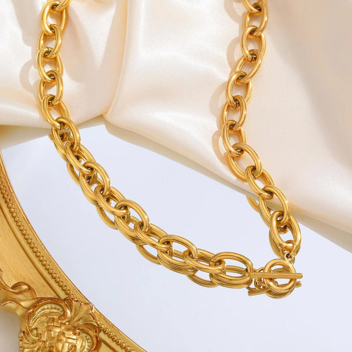 The Chaîne Royale Necklace is crafted with 12 mm rolo chain links and plated in radiant 18K gold over premium stainless steel. Its statement silhouette and elegant toggle clasp make it the perfect balance between timeless luxury and modern edge — a true must-have for elevating any look.