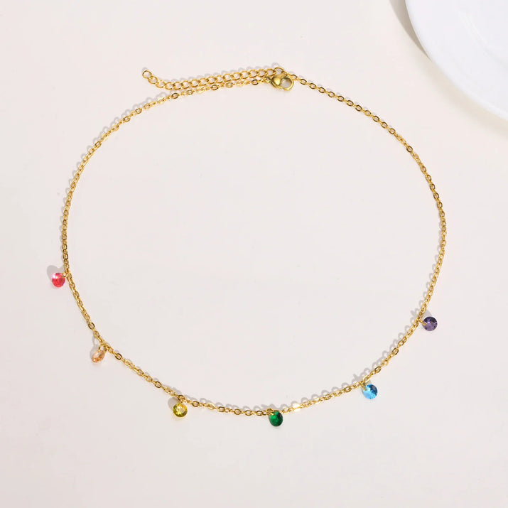 The Celestia Drop Necklace captures the magic of light and color in every movement. Featuring delicate colored CZ stones set on a fine gold-plated stainless steel chain, this piece adds a radiant touch to any outfit — day or night.