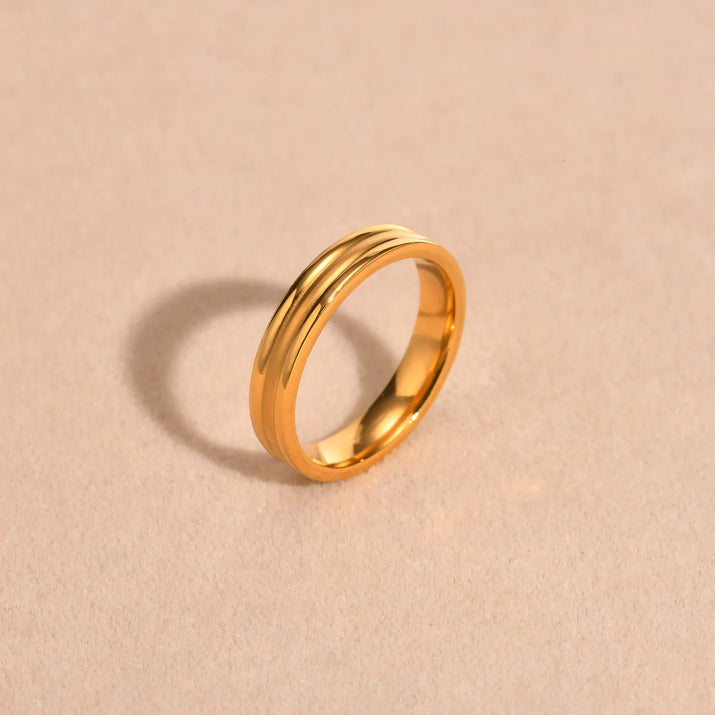 This elegant 18K gold–plated triple band ring is crafted with premium stainless steel for a sleek and timeless look. Its smooth layered design makes it a perfect statement piece for everyday wear or special occasions.