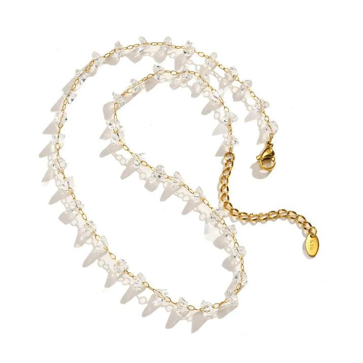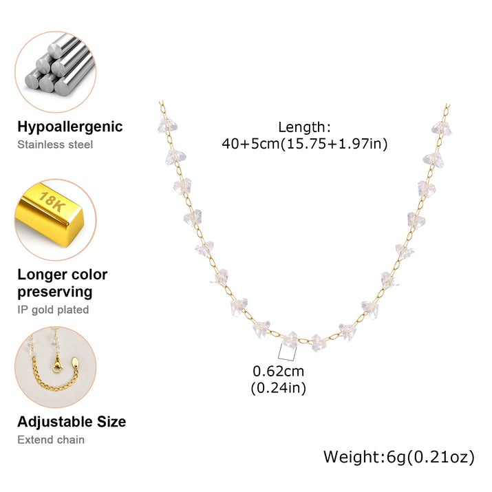 A delicate fusion of irregular transparent crystals and a gold-plated stainless steel chain, designed to radiate effortless sophistication. Its subtle shimmer captures the light beautifully, making it a timeless statement for both day and night. Perfect for those who love elegance with a modern touch.
