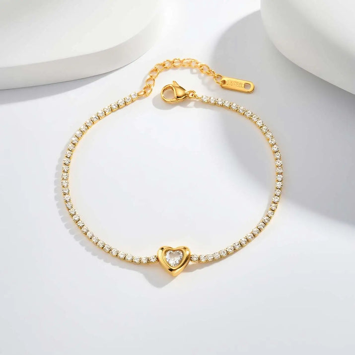 A delicate symbol of romance and elegance, the Amour Éclat Bracelet features a radiant heart-shaped zircon centerpiece set on a shimmering chain. Its sleek gold-plated finish adds a touch of luxury to every movement, making it the perfect piece to elevate your everyday or evening look.