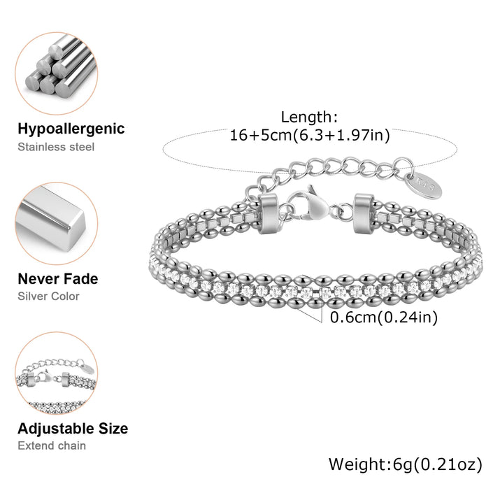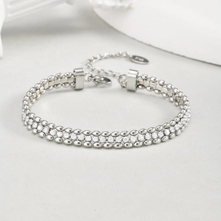 A timeless blend of elegance and craftsmanship, this Double Row Olive Bead Zircon Bracelet adds a touch of refined luxury to any look. Crafted from high-quality stainless steel and finished in either radiant gold or sleek silver, it features a double-row olive bead design accented with AAA white zircon stones for a brilliant sparkle.