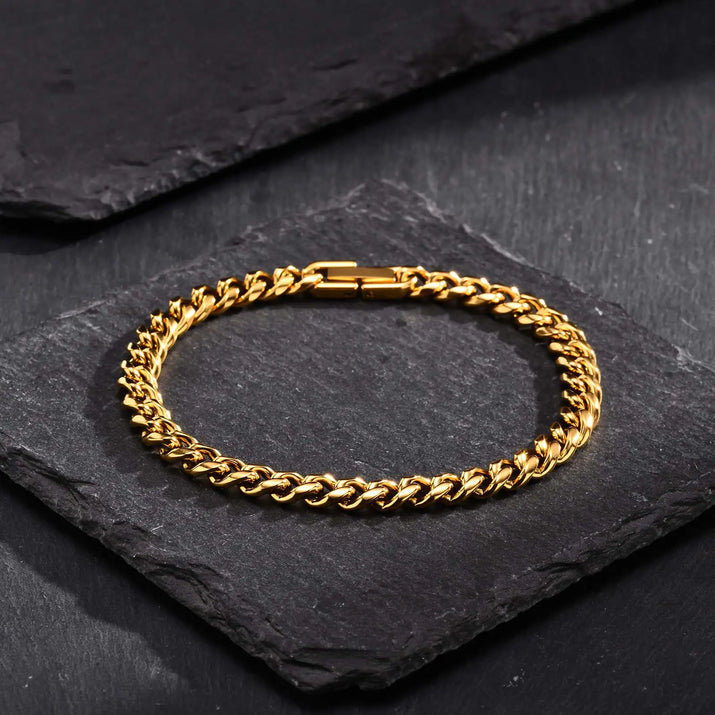 A timeless statement piece crafted for elegance and strength. This Cuban chain bracelet is made with premium stainless steel and 18K gold plating — delivering bold shine, luxurious feel, and everyday durability.