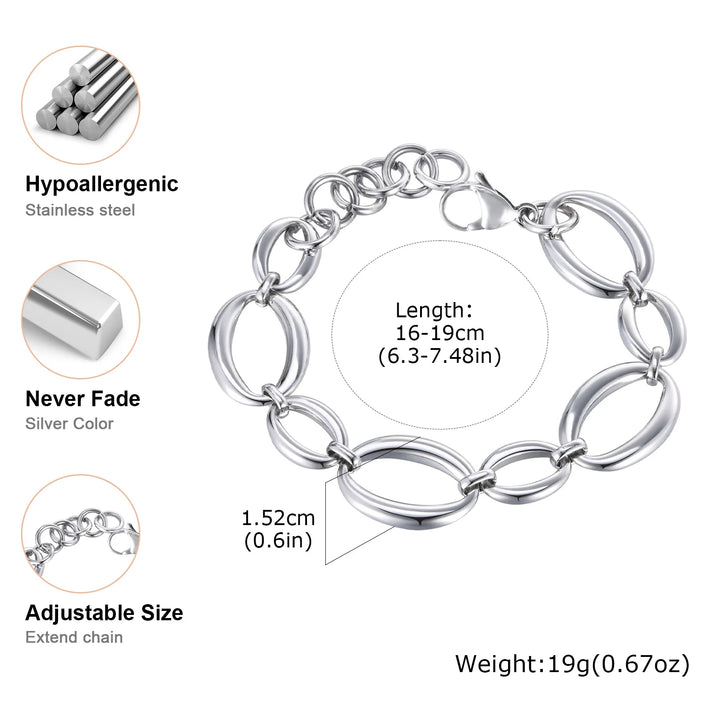 A modern oval link bracelet crafted from premium stainless steel. Its bold, lightweight design makes it perfect for both elegant and casual looks.