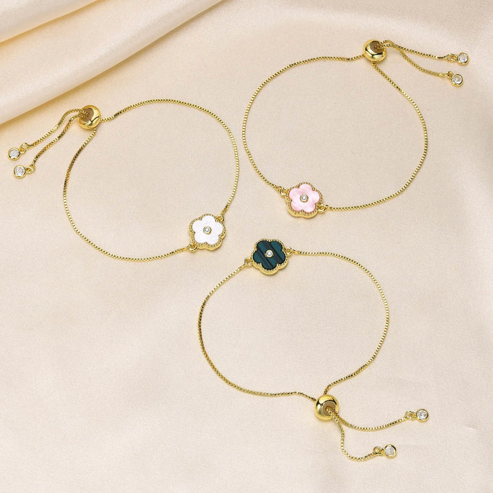 The Fleur Élégante Bracelet embodies timeless elegance with its delicate floral charm. Featuring a slim adjustable box chain and 18K gold finish, this piece is perfect for everyday sophistication or special occasions. Available in three luxurious colors — soft pink, classic black, and pearl white.